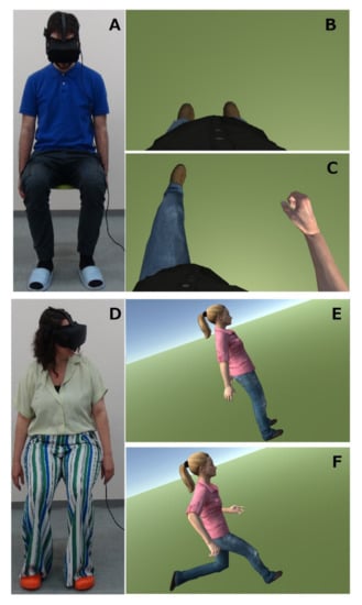 Before the participants wore the IVR visor, the experimenter explained how the training and the questionnaire were to be administered. In particular, the experimenter explained the correct position to maintain: participants had to sit on a footstool with their feet firmly touching the ground and their arms relaxed along the sides of their body (Figure 2A,D). Participants were instructed not to move their bodies throughout the whole experience; however, they could rotate their heads and the virtual scene would simultaneously and coherently change to maintain their perspective as realistically and plausibly as in real life. The participants wore the Oculus Rift visor (oculus.com, accessed on 6 February 2020), which has two lenses that are positioned in correspondence to the user’s eyes, and were shown a virtual environment (modeled in Unity3D), which was composed of a simple open space with a meadow-like green floor and a natural-like bright sky that were separated by a visible horizon. The avatars that were used in this study were gender-matched and life-sized humanoid standing bodies, which were downloaded from the public Microsoft Rocketbox Avatar library []. Participants were instructed to always look at the virtual body, especially the legs. For the entire duration of the IVRt, we repeatedly asked the participants to report any feelings of discomfort, nausea, sickness, etc.