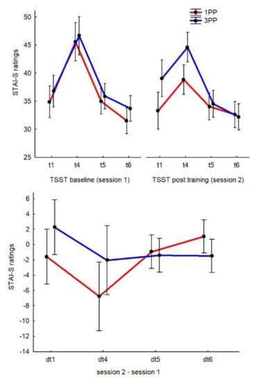 Graphs of the STAI-S results. The top chart represents the two sessions separately and the bottom chart represents the differences between the sessions. The time points (t) and delta time points (dt) of the STAI-S measurements are represented as in Figure 3.