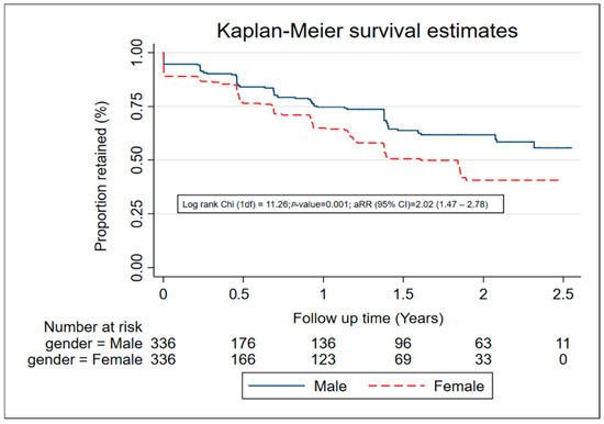 The median time of follow-up was 11 months (range: 0–31 months). A total 214 (31.8%) participants were LTFU over 607.8 PYO, an overall LTFU rate of 35.2/100 PYO. Of those LTFU, 78 (36%) did not attend any follow-up visit, or only attended one follow-up visit. The median time to LTFU for women was 1.5 years, while that for men was more than 2.5 years (Figure 1). The commonest reasons for LTFU were: being uncontactable (38%), moving out of the study area (27%), and withdrawing from the study (31%). Four participants died during follow up. LTFU was highest among participants that were aged 18–24 years (41.8/100 PYO, female (44.7/100 PYO), Christian (38.3/100 PYO), those working as salon/bar workers/street vendors (48.7/100 PYO), and in the 2020–2021 calendar period (42.6/100 PYO). There was weak evidence that LTFU was associated with age, with participants aged 18–24 years more likely to be LTFU (aRR = 1.29, 95% CI 0.80–2.11) compared with those aged 35–45 years. Female sex (adjusted rate ratio (aRR) = 2.07, 95% CI 1.51–2.84) and recreational drug use (aRR = 1.61, 95% CI 1.12–2.34) were significantly associated with increased LTFU. Transactional sex in the past month was associated with increased LTFU (aRR = 1.36, 95% CI 0.97–1.90) but this difference was not significant. LTFU was higher in 2020–2021 compared to 2018–2019 (aRR = 1.54, 1.17–2.03). LTFU was lower in Muslims (or other) than Christians (aRR = 0.68, 95% CI 0.47–0.97) and in participants who reported sex work as an occupation compared to those who did not (aRR = 0.47, 95% CI 0.31–0.72). Participants who reported abnormal genital discharge in the past 3 months had lower LTFU than those who did not (aRR = 0.79, 95% CI 0.59–1.04), but this difference was not significant (Table 1).
