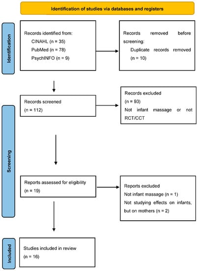 After the duplicates were removed, the title and abstract of 112 articles were reviewed. Articles whose title and abstract did not meet the inclusion criteria were excluded (e.g., the article focused on another type of massage, such as cardiac massage, massage on the mother, or reflexology; review articles; or articles that did not examine the outcome in PICO). After this initial review of the title and abstract, a total of 19 articles were reviewed in their entirety; however, one article was excluded since it did not examine infant massage, and two articles were excluded since they did not examine the outcome in PICO (Figure 1).