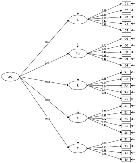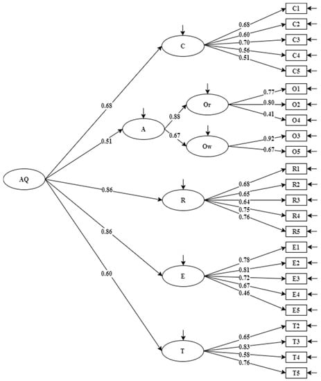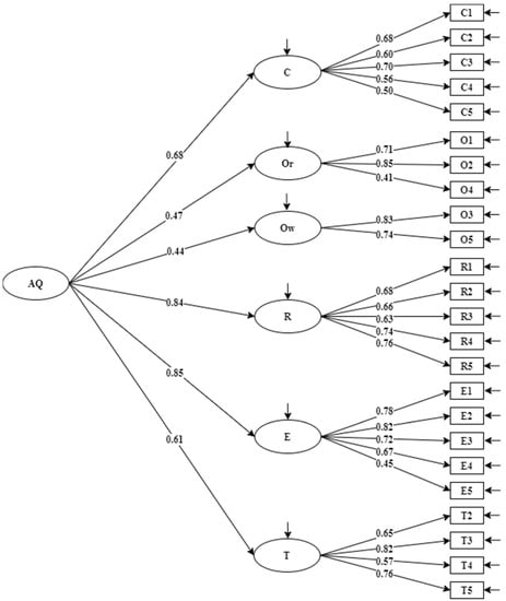 Model 2 with standardized factor loadings on control (C), ownership and origin (O2), reach (R), endurance (E), transcendence (T), and adversity quotient (AQ) (n = 242).