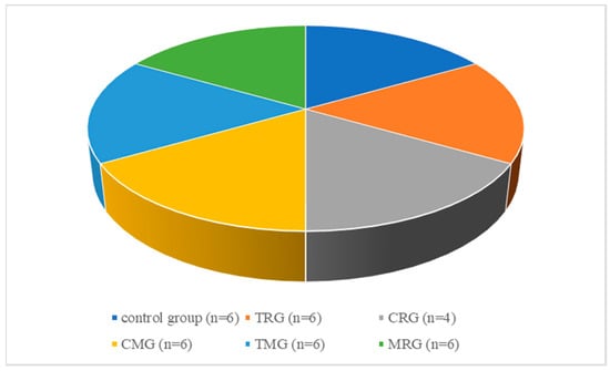 The biological material of the current study was rat aortas that were the archival material accumulated in the Department of Nephrology, Transplantology and Internal Medicine, Pomeranian Medical University in Szczecin, obtained from an experiment performed previously by Kędzierska et al. (2013). This study was approved by the Szczecin Local Ethical Committee for Experiments on Animals (decision no. 24/2008, dated 24 November 2008) []. The animals were divided into six groups: the control group (C) and 5 experimental groups—six rats/group, however, two rats from the CMG group died during the experiment. The animals of the control group did not receive any drugs, while the rats of the individual experimental groups were administered different combinations of immunosuppressants, according to the most commonly used treatment models in kidney recipients: tacrolimus (T); cyclosporin A (C); rapamycin (R); mycophenolate mofetil (M); glucocorticosteroids (G) (Figure 1). The following doses of drugs were used in the experiment: tacrolimus (Prograf)-4 mg/kg/day, mycophenolate mofetil (Cellcept)-20 mg/kg/day, cyclosporin A (Sandimmun-Neoral)-5 mg/kg/day, rapamycin (Rapamune)-0.5 mg/kg/day, prednisone (Encorton)-4 mg/kg/day. The mean body weight of the rats was 305 g. The rats gained weight during the experiment, so the dose of each drug was changed after 3 months of the experiment, adjusting for the body weight of the animals. After 6 months of the experiment, the mean body weight of the rats in each group was as follows: control 573.2 g; TRG 403 g; CRG 467 g; MRG 435.6 g; CMG 544 g; TMG 482.5 g. There was a statistically significant difference between the control group and the TRG group. In the experiment the animals were treated with the pharmaceutical form of each used drug for 6 months in accordance with formerly published data [].