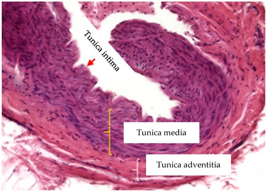 Under physiological conditions, endothelial and smooth muscle cells control the secretion of MMPs and their inhibitors (TIMPs—metalloproteinase inhibitors) at a constant level. This allows maintaining a balance between the degradation and synthesis of the elements in the blood vessel wall. Due to their substrate specificity, metalloproteinases are divided into five main groups. Two of them, MMP-2 and MMP-9, are widely recognized markers for remodeling the artery wall [,]. They belong to gelatinases, which are characterized by the ability to hydrolyze proteins such as collagen type III, collagen type IV, collagen type V, elastin, laminin, fibronectin [,,]. The inhibitors of MMP-2 and MMP-9 are TIMP-2 and TIMP-1, respectively. Under the influence of stress factors, and consequently as a result of a response to inflammation, the expression of MMPs is increased [,,,,]. Moreover, Blankenberg et al. (2003) and Ferroni et al. (2003) reported a positive correlation between the increased concentration of MMP-9 in blood serum and the occurrence of acute coronary syndrome in patients. Thus, the control of expression and the activity of enzymes that degrade ECM proteins play a key role in the proper structure and function of blood vessels [,]. A disturbed balance between the activity of MMPs and TIMPs plays a fundamental role in the pathological remodeling of extracellular components and in cell migration and proliferation, ultimately leading to dysfunctional changes in the blood vessels. A correlation has been observed between the increased activity of gelatinases and diseases such as coronary artery disease, aneurysms, peripheral arteriosclerosis, and arterial hypertension [].