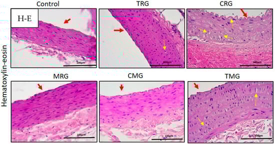 Aorta of rats treated with panels of immunosuppressive drugs. TRG, CRG, TMG—yellow arrows indicate changed shape of vascular smooth muscle cells in media; CRG—folded tunica intima. Red arrows indicate aortal intima. Hematoxylin-eosin (H-E) staining. Objective magn. ×40; bar 100 μm.