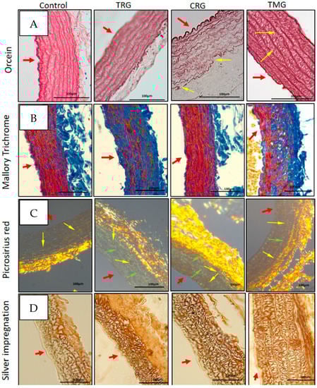 Staining with orcein showed the arrangement of the elastic lamellae in the tunica media of the control and experimental groups. A thickening of the lamellae (arrows) was visible in the media of TMG rats and additionally, a disintegration of the arrangement and local fragmentation of elastic fibers (arrows) in the tunica media of rats treated with CRG drugs was observed (Figure 4A).