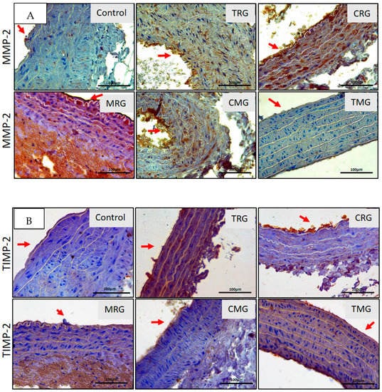 Immunolocalization of MMP-2 (A) and TIMP2 (B) in aorta of rats in all groups. Red arrows indicate aortal intima. IHC A and B. Objective magn. ×40; bar 100 μm.