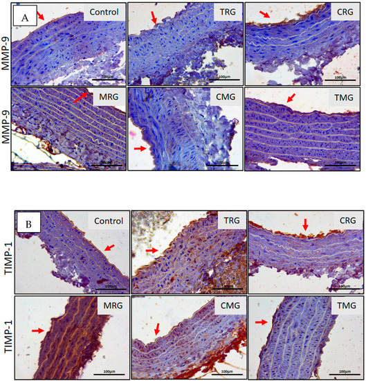 Immunolocalization of MMP-9 (A) and TIMP1 (B) in wall of aorta in all groups of animal. Red arrows indicate aortal intima. IHC A and B. Objective magn. ×40; bar 100 μm.
