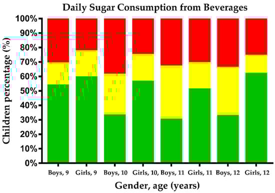 The daily sugar consumption from beverages by sex and age clusters is depicted in Figure 1. A high consumption of sugars (>25 g) was positively associated according to age groups. Additionally, boys reported a higher total relative energy intake (%) from sugar than girls (57.2 ± 25 vs. 52.2 ± 26; p = 0.008).