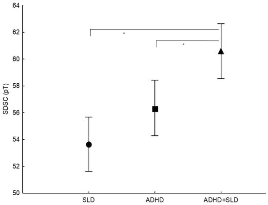 By comparing the three groups on SDSC subscales scores, a significant main effect of Group (F2,225 = 11.43, p = 0.001, ηp2 = 0.09) was found. Post hoc analyses (Tukey’s HSD tests) showed that children with ADHD+SLD had significantly higher scores than children with ADHD (p = 0.011) and children with SLD (p = 0.001). Coversely, children with ADHD and children with SLD did not differ (p = 0.157) (Figure 1).