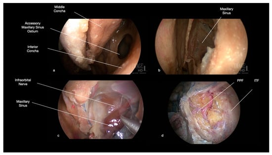 1. Karkas, A.; Zimmer, L.A.; Theodosopoulos, P.V.; Keller, J.T.; Prades, J.M. Endonasal endoscopic approach to the pterygopalatine and infratemporal fossae. Eur. Ann. Otorhinolaryngol. Head Neck Dis. 2020, 138, 391–395. [Google Scholar] [CrossRef] [PubMed]