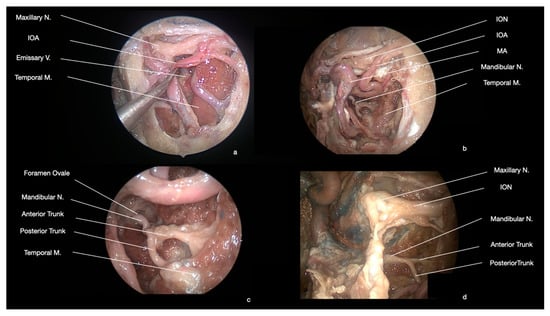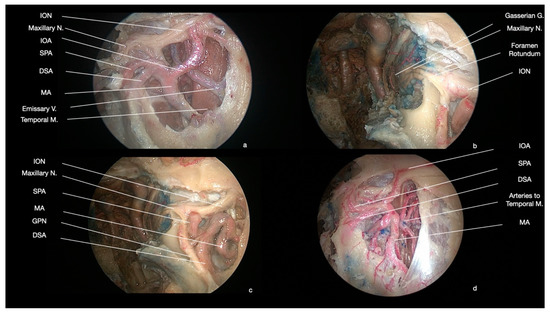 59. Theodosopoulos, P.V.; Guthikonda, B.; Brescia, A.; Keller, J.T.; Zimmer, L.A. Endoscopic approach to the infratemporal fossa: Anatomic study. Neurosurgery 2010, 66, 196–202. [Google Scholar] [CrossRef]