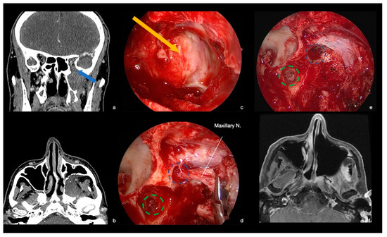 Figure 5. CT scan, MRI, and intra-operative endoscopic images (0° scope). (a,b) Coronal and axial NECT showing the PPF mass. An enlarged foramen rotundum, due to tumor infiltration of the maxillary nerve was observed (blue arrow). (c) Intra-operative image. After medial maxillectomy, at the posterior wall of the maxillary sinus, it was possible to observe a bulge directed anteriorly due to the presence of the mass in the PPF (yellow arrow). The infra-orbital nerve was evident in the roof of the maxillary sinus. (d) Intra-operative image. The maxillary nerve resulted infiltrated by the tumor and was resected up the foramen rotundum (blue circle), while the vidian nerve had been already resected at the opening of pterygoid canal (green circle). (e) Intra-operative image. At the end of tumor removal, no tumor remnants were observed and foramen rotundum (blue circle) and opening of pterygoid canal (green circle) are visible. (f) MRI. Axial slice. T1 w-sequence with contrast agent. Radical tumor resection with no surgical complications was confirmed.