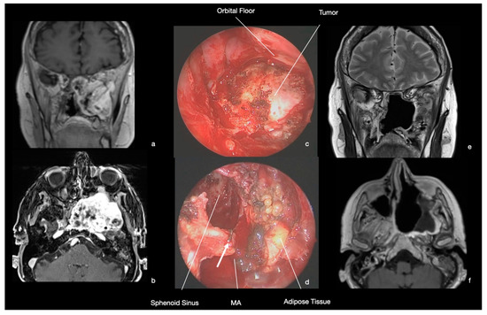 Figure 6. MRI and intraoperative endoscopic images (0° scope). (a,b) MRI. T1 w-sequence with contrast agent. A large mass extending in the left PPF and ITF was demonstrated. The floor of the orbit was pushed superiorly, with no suspect of periorbit infiltration. (c) Intra-operative image. After medial maxillectomy and resection of the posterior wall of maxillary sinus, the soft tumor was progressively resected. It was possible to cleave the lesion from the orbital floor. (d) Intra-operative image. At the end of the surgery, the tumor was completely resected with preservation of PPF anatomical structures. The maxillary artery (MA) has been identified and clipped (white arrow) during the tumor removal. (e,f) MRI. Coronal and axial view. T2 w-sequence and T1 w-sequence with contrast agent. Radical tumor resection was confirmed with no surgical complications.