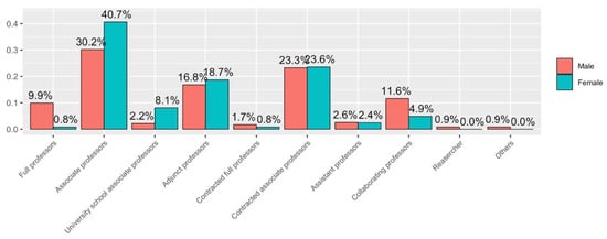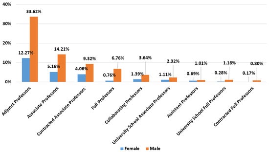 By job category, in this distribution (Figure 11) the glass ceiling can be recognised, since in both genders the sum of the percentages of the categories Full Professor, Contracted Full Professor, Associate Professor and Contracted Associate Professor is almost identical, but in the case of the male gender it is possible to see the difference in ratios, with male numbers of Full Professors and Contracted Full Professors of 23 (9.9%) and 4 (1.7%) respectively, while in the female gender, it is a very small sample: 1 (0.8%) and 1 (0.8%).