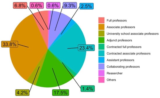 By job category, the largest group that answered the survey was the Associate Professor (statutory staff), with 33.8% of the answers obtained, followed by the Associate Professor (contractual staff), with 23.4%, and then the Assistant Professor, with 17.5%. Figure 4 shows the participation of the different job categories in the survey.