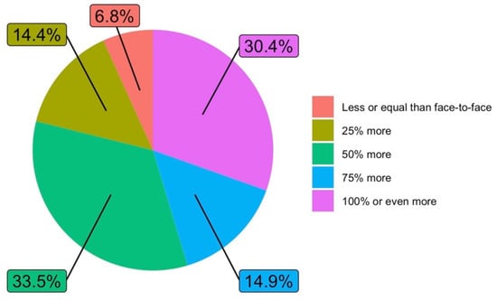 In relation to the volume of work devoted to virtual teaching compared to the volume of work devoted to face-to-face teaching in a normal situation (Q2), 30.4% of the answers stated that the increase in time spent had been 100% or even more. The sum of those who claimed to have spent between 50% and 100% or more is 78.8%. Figure 5 details the total responses obtained on the workload.