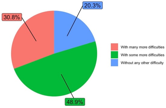 Regarding the reconciliation of teaching activity during the health crisis with personal life, faculty were asked “How do you reconcile teaching activity throughout the health crisis with personal life with respect to the normal situation?” (Q3). Almost half of the respondents stated that reconciliation had occurred with some more difficulties with respect to the normal situation. Only 20.3% said they had no difficulty with reconciliation. Figure 6 shows the answers to this question.