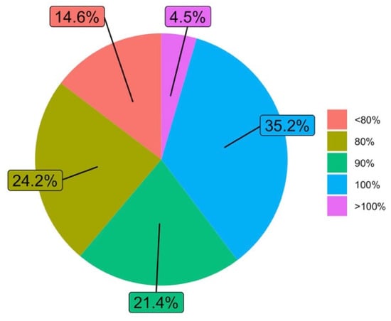 With respect to the percentage of a subject that faculty managed to teach in comparison with previous courses (Q9), it is found that one third of the answers indicate that they have been able to meet the syllabus of the subjects, but the other two thirds state that they have fallen below 100% of the achievement of the syllabus, which may be related to the difficulties in developing the subjects in a virtual environment. However, almost two-thirds of the responses show that they have reached 90% of the syllabus or higher, which must be assessed very positively. See Figure 8.