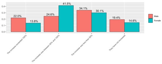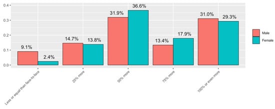 In relation to the volume of work devoted to virtual teaching compared to the volume of work devoted to face-to-face teaching in a normal situation (Q2), as can be seen in Figure 12, more than three-quarters of those surveyed considered that the volume of time spent on virtual teaching compared to the normal situation has increased by at least 50%. It can be seen that women have spent 50% or more time in virtual teaching (85% of women) compared to face-to-face teaching than men (75% of men).