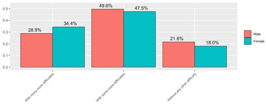 With the arrival of COVID-19, in a short time, women have faced a short-term reorganization of attention to daily household tasks and time spent at work, as Cesaroni et al. [] manifest. Scientific literature has found in research that women take on most of the household chores and childcare, thus seeing a 30% reduction in paid work time and, especially mothers, experiencing a further dramatic impact on their well-being during the pandemic, especially when the usual support networks, such as grandparents, friends and neighbours, can no longer help with childcare []. Women must face the balance between work and personal life because gender issues before the confinement were not ideal with respect to women’s rights and gender equality was one of the most urgent societal challenges before the pandemic, as Cesaroni et al. [] report. Evidence from various studies [,,] suggests that female academics with homecare responsibilities are being disproportionately impacted during the pandemic. Other universities are also reported to have shirked their responsibility to ensure the full participation of women in the workforce [].