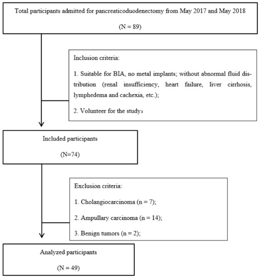 This prospective study included 74 participants diagnosed with space-occupying lesions of the head of the pancreas admitted for pancreaticoduodenectomy surgery at the General Surgery Department in the Peking Union Medical College Hospital (PUMCH) between May 2017 and May 2018. We applied the following patient inclusion criteria: those with pancreatic cancer confirmed by pathology; those who underwent laparoscopic or open pancreaticoduodenectomy surgery; and those able or willing to give informed consent. We excluded 7 participants diagnosed with cholangiocarcinoma through the postoperative paraffin pathology, 14 with ampullary carcinoma, 2 with benign tumors, and 2 with metachronous metastatic cancer. Finally, we collected and analyzed data from 49 participants (Figure 1). Clinical data, such as age, sex, BMI, and serum albumin (ALB), were recorded. This study was approved by the medical ethics committee of PUMCH, approval No. NCT02831725. The study was conducted in accordance with the ethical standards of the Helsinki Declaration of 1975.