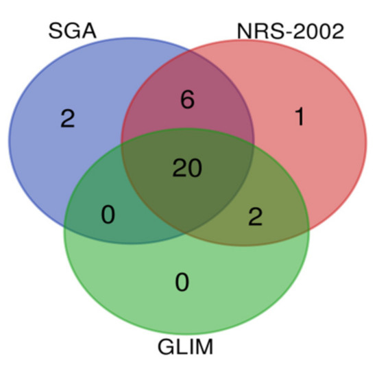 Venn diagram about the number of participants with malnutrition status according to the different nutritional status assessment methods.