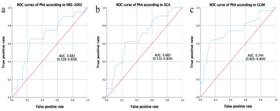 ROC curves of PhA to predict the patient nutrition status according to Nutritional Risk Screening 2002 (NRS-2002, (a)), Subjective Global Assessment (SGA, (b)), and Global Leadership Initiative on Malnutrition (GLIM, (c)). AUC: Area under the curve.