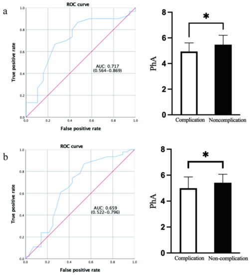 ROC curves of PhA to predict the postoperative complications and bar graphs of PhA values between the complication group and the non-complication group. (a) The results of 49 participants with pancreatic head cancer. (b) The results of 74 participants who underwent pancreaticoduodenectomy. * p < 0.05.