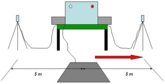 Subjects performed the Take-Off Reaction Test (Newtest Powertimer®, Oulu, Finland) (Figure 1). Participants initiated the action, left or right, from the padel rest position, after reacting to light (left or right) emitted randomly by a device. Subjects left the contact mat and made a lateral run to the left or right photocells (placed 5 m from the mat). Subjects completed 12 attempts (six to the left and six to the right) and recorded the best result. All attempts were performed consecutively with a brief 30 s rest period. The protocol was similar to that employed by Castellar et al. [38].