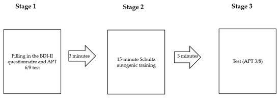 During the first stage of the study, each subject completed the BDI-II questionnaire and the 6/9 version of the APT test. Each subject was then asked to take a comfortable position on the couch. The investigator used a portable speaker to present the pre-prepared Schultz autogenic training, turned off the lights, and left the study room for the duration of the relaxation session. The training lasted 15 min. Following the relaxation training, the subjects performed the 3/8 version of the APT test.