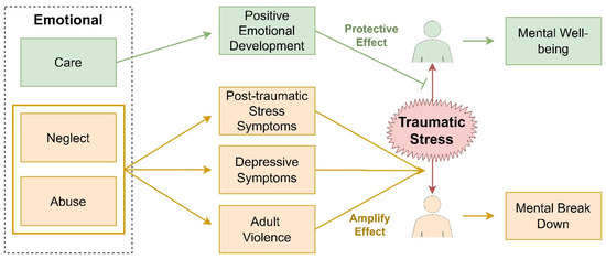 Children during infancy should receive consistent and constant emotional care because it is a critical period of emotional, social, and cognitive development. The opposite of emotional care can be classified into two subtypes: one is active emotional abuse, which receives much attention, and the other is passive emotional neglect [72]. If emotional neglect occurred early in life, social and emotional rehabilitation deficiencies could be seen after being inflicted with traumatic stress [73,74,75]. A four-year longitudinal research on adopted children who experienced emotional neglect showed that children were in the clinical or borderline ranges for symptoms of post-traumatic stress arousal (19%), avoidance (14%), and intrusion (8%) [76]. Figure 1 provides a general overview of the information about emotional care discussed in this section.
