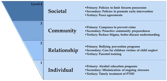 As primary prevention aims at preventing disease occurrence, in a trauma situation, it aims at preventing exposure to trauma. As discussed earlier, there are many causes of trauma, and specific interventions can be directed at these causes. At the individual level, interventions can be in the form of educational programs on the risk of alcohol drinking and firearm acquisition for the youth and parental guidance for young children, as well as college programs to educate young adults about traumatic experiences [112]. Additionally, psychoeducation programs target military personnel prior to deployment on trauma reaction [113]. At the relationship level, parental and caregiver guidance and education can aim at reducing traumatic experiences for the children, for example, bullying at school or programs to reduce assaultive violence. At the community level, interventions include community support services, neighborhoods, and streets surveillance campuses. At the societal level, policies can target reducing the acquisition of firearms and alcohol consumption, as well as recalling defective motor vehicles and street maintenance [114] (Figure 2).