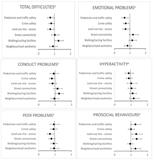 Parents’ positive perceptions of pedestrian and traffic safety (OR 0.64; 95% CI 0.47, 0.87), crime safety (OR 0.73; 95% CI 0.58; 0.92) and land use mix–access (OR 0.71; 95% CI 0.53, 0.96) were associated with lower odds of emotional difficulties. Parents’ positive perceptions of crime safety (OR 0.79; 95% CI 0.64, 0.97) were associated with lower odds of conduct problems, and positive perceptions of walking/cycling facilities were associated with higher odds of conduct problems (OR 1.22; 95% CI 1.00, 1.49). Positive perceptions of land use mix–access (OR 0.69; 95% CI 0.52, 0.92) and street connectivity (OR 0.78; 95% CI 0.62, 0.99) were associated with lower odds of peer problems.