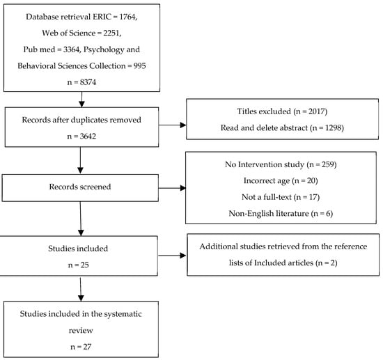 A total of 8374 related studies were obtained through an initial search of the database. Firstly, the articles are imported into the literature management software Endnote, and 3642 articles were obtained after the duplicate articles were removed. After reading the title and abstract and excluding the non-full-text, 327 articles were initially obtained. Subsequently, the rest of the articles were reviewed by full-text reading, and 25 full-text articles were obtained after excluding irrelevant articles. In addition, two related articles were supplemented by manual retrieval of reference articles. Finally, 27 articles were included for systematic review and analysis (Figure 1).