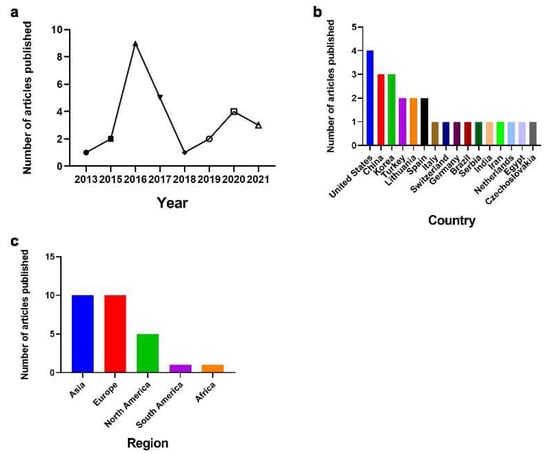 Authors’ region and country of origin. As shown in Figure 2b,c, the 27 relevant research papers included in this study are from the United States, China, Korea, Turkey, Lithuania, Spain, Italy, the Netherlands, Switzerland, Serbia, Germany, Brazil, Egypt, Czechoslovakia, Iran, and India. Geographically, Asian countries published 10 articles, accounting for 37% of the total, European countries published 10 articles, accounting for 37% of the total, North America published 5 articles, accounting for 19%, Africa published 1 article, accounting for 3% and South America published 1 article, accounting for 3%. (Figure 2b,c).