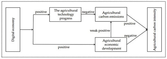 From the formula of agricultural carbon intensity, reducing agricultural carbon emissions and developing the agricultural economy will reduce agricultural carbon intensity. The effect of the digital economy on agricultural carbon intensity can be achieved by affecting agricultural carbon emissions and agricultural economic development, as shown in Figure 1.