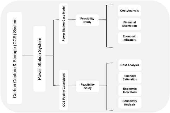 In order to conduct a feasibility study based on a techno-economic evaluation, three prior consecutive steps that could be treated as individual studies must be completed by selecting a CCS system, a PS system, and the case models, as depicted in Figure 2, showing the tree structure for the methodology followed. The CCS system is chosen by applying the statistical average method on the low-cost accounting technique (SAMLCAT). In other words, multiple case study models (CSMs) of the selected systems mentioned for the CCS are presented, and the system with the lowest average cost (LAC) is chosen as the primary system. Therefore, the assessment is conducted on sound grounds, and the power station and the CCS project based on economic indicators is evaluated, resulting in the most realistic evaluation, as encompassed in Figure 2. Moreover, in the second step, a power station system is selected, based on the power generation technologies and economic conditions that are applicable for MEW in the State of Kuwait. Additionally, in the third consecutive step, a CSM is selected for two entities—the power station installed capacity (PSIC) and the CCS facility (CCSF)—based on the literature review and statistical average methods (Figure 2) [38]. Furthermore, and once completed, the feasibility study is used to evaluate the above selected CSMs. Moreover, and as shown in the tree methodology depicted, there are two feasibility studies—one for the power station case model (PSCM) and the other for the CCSF case model (CCSFCM). Additionally, the first feasibility study has three sections—cost analysis, financial estimation, and economic indicators. Similarly, the second feasibility study contains four sections—cost analysis, financial estimation, economic indicators, and sensitivity analyses for the CCS project.