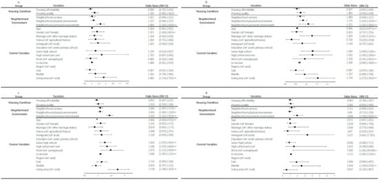 | Neighborhood perceived environment | 1.447 *** (1.361, 1.541) | 0.000 | 1.226 *** (1.151, 1.306) | 0.000 |
