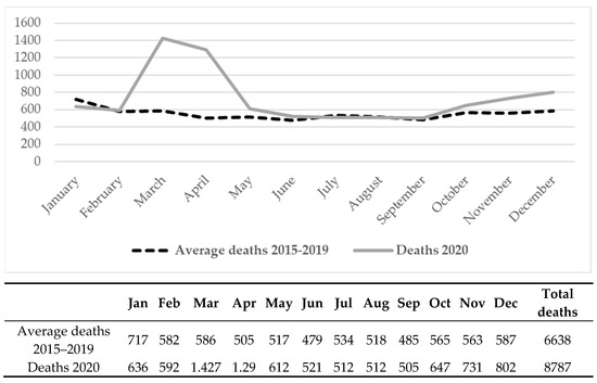Figure 1 shows the overall number of deaths from all-cause mortality in 2020 and the average deaths in the 2015–2019 period per month. Deaths were particularly high in the two months of March (1427) and April (1290), followed by December and November, while the lowest numbers of fatalities were observed during the summer months. Fatalities increased greatly in March and April 2020 (+149%) with a smaller increase in May and a second slighter peak from October to December. On the other hand, before the COVID-19 outbreak (January–February 2020) mortality rates were lower than those recorded in the previous five-year period (−5.5%) and no significant mortality excess emerged during the summer period (June–September 2020).