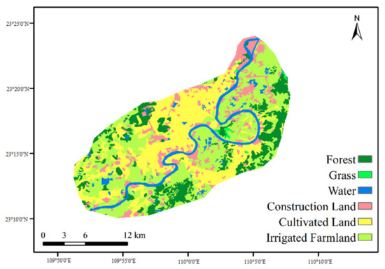 Landsat-TM remote sensing image data with cloud volume ≤5% were downloaded in 2015 and 2020 from the official NASA website, and were preprocessed by radiation calibration, atmospheric correction, band synthesis, and image clipping. The results classified the land use into cultivated land, forest, grassland, water area, construction land, and unused land according to the classification system of the CAS (Chinese Academy of Sciences). The cultivated land in the Yujiang River Basin was further divided into cassava, corn, rice, and other cultivated land on the basis of different crop phenological information. The visualized spatial distribution maps of land-use types were displayed by raster data.