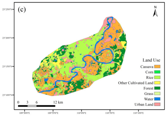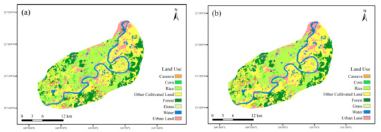 The land-use types of the Yujiang River Basin included cassava, corn, rice, other cultivated land, forest, water area, and construction land. The interpretation results of the two terms are displayed in Figure 4.