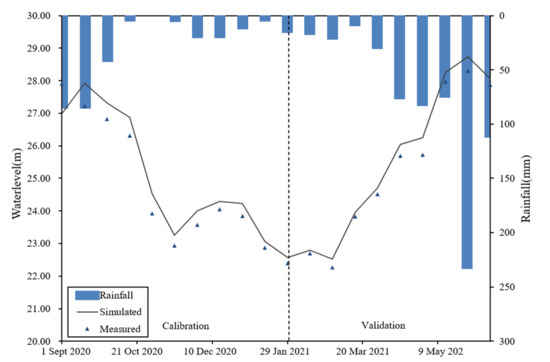 Calibration period data of the Guiping Hydrological Station was selected from 1 September 2020 to 31 January 2021, and the verification period was set from 1 February 2021 to 13 June 2021 in the Yujiang River Basin. Through parameter adjustment, the final simulated and measured water level values were determined as shown in Figure 5.