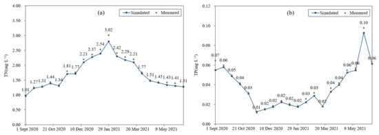 Measured and simulated TN (a) and TP (b) in the Yujiang River.