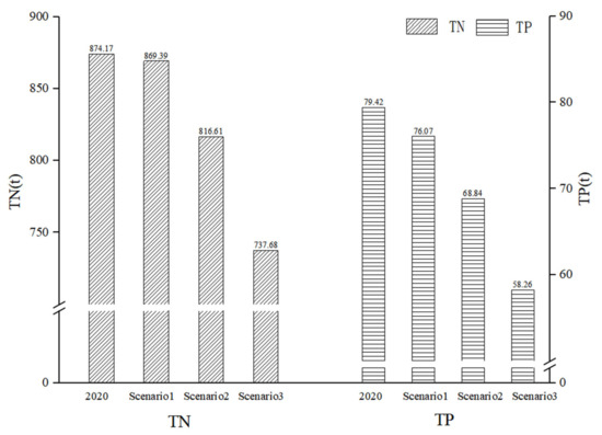 Taking the land-use distribution under the three scenarios into the validated hydrological model, the TN loads at the basin outlet were 869.39 tons, 816.61 tons, and 737.68 tons, respectively. Meanwhile, the TP loads were 76.07 tons, 68.84 tons, and 58.26 tons, respectively (Figure 8). The results revealed that the cassava area replacing other cultivated land could assist in reducing the nonpoint source pollution load.