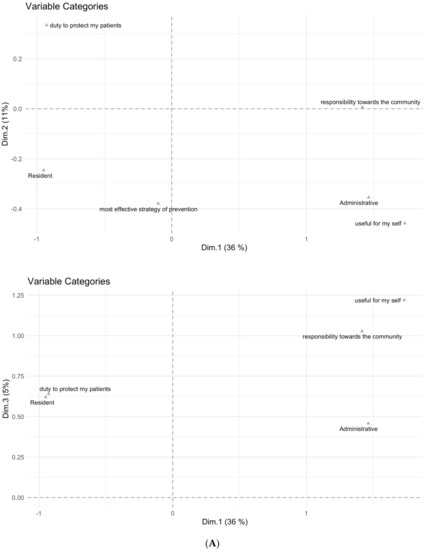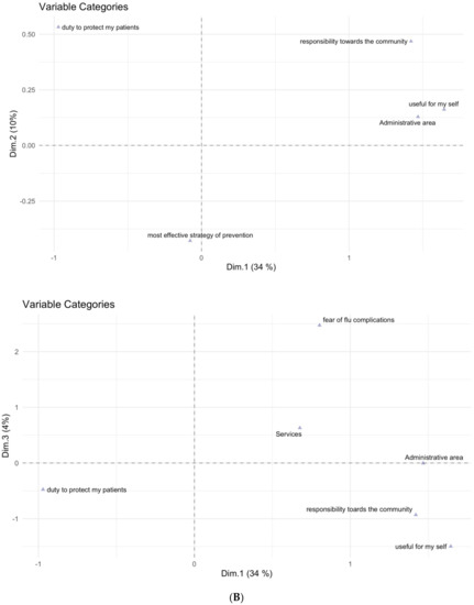 (A). HCWs’ qualifications and reasons for flu vaccination uptake resulted to be associated in the new planes defined by the first three dimensions (Dim 1, Dim 2, and Dim 3) computed by the MCA. The three dimensions can be considered as new variables that try to summarize the variability present in the dataset in a quantitative way. This way, particular response profiles characterized by different values of these new dimensions can be extracted from the individual responses that were given to the questionnaire questions. For better interpretability, labels of different reasons have been shortened as follows: reason 1, i.e., “Vaccination is the most effective strategy of prevention” to “most effective strategy of prevention”; reason 2, i.e., “COVID-19 pandemic made me aware that vaccination is useful for myself” to “useful for myself”; reason 3, i.e., “COVID-19 pandemic made me aware that vaccination is an act of responsibility towards the community” to “responsibility towards the community”; and reason 9, i.e., “As HCW it’s my duty to get vaccinated to protect my patients” to “duty to protect my patients”. (B). HCWs’ areas of activity and reasons for flu vaccination uptake resulted to be associated in the new planes defined by the first three dimensions (Dim 1, Dim 2, and Dim 3) computed by the MCA. For better interpretability, labels of different reasons have been shortened as follows: reason 1, i.e., “Vaccination is the most effective strategy of prevention” to “most effective strategy of prevention”; reason 2, i.e., “COVID-19 pandemic made me aware that vaccination is useful for myself” to “useful for myself”; reason 3, i.e., “COVID-19 pandemic made me aware that vaccination is an act of responsibility towards the community” to “responsibility towards the community”; reason 6, i.e., “I fear the complications of the flu” to “fear of flu complications”; and reason 9, i.e., “As HCW it’s my duty to get vaccinated to protect my patients” to “duty to protect my patients”.