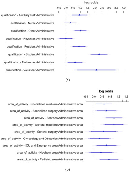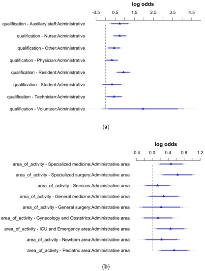 HCWs’ propensity towards being newly vaccinated against influenza-log of the odds and their 95% CIs extracted from two models having HCWs’ qualification (a) and area of activity (b) as predictor variables. Statistical significance for the effects is shown when the 95% Confidence Intervals do not cross the vertical dashed line set to 0.