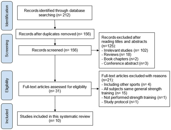 The search strategy consisted of collecting all results from the four databases and removing duplicates. Articles identified by the search strategy were screened by title and abstract. Then, a complete reading of the selected articles was carried out and articles that did not meet the inclusion criteria were excluded. These studies were ruled out for four different reasons: (I) other sports were included, (II) all subjects performed the same general strength training, (III) strength training was not performed, (IV) study protocol was insufficient.