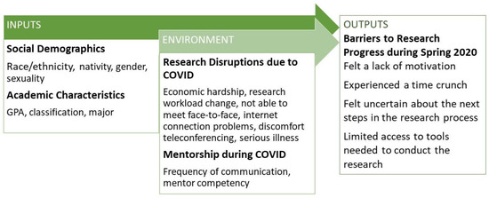 How the COVID-19 pandemic has affected undergraduate researchers is poorly understood [13,14,33,34]. To advance knowledge, we developed and administered a survey to over 1000 undergraduate students across the country who were doing or planning to do research in spring and/or summer 2020. Here, we examine the subset of student respondents who were still actively conducting research under the direction of a faculty mentor in mid-March and April 2020. This paper examines how social demographics, academic characteristics, research disruptions and faculty mentorship are associated with four barriers to research progress: experiencing a lack of motivation for conducting research, experiencing a time crunch with regard to conducting research, uncertainty about the next steps in the research project and a lack of access to the tools needed to conduct research. Although research has not established the specific barriers that undergraduate researchers faced during the early months of the COVID-19 pandemic, there is an emerging literature on college students and their transition to online learning, which provides some insight for comprehending the challenges faced by undergraduate researchers. In what follows, we present our conceptual model, which is an input–environment–output (IEO) model [35]. We then review literature relevant to our input and the environment independent variables as well as our dependent variables (outputs).