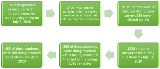 - Erickson, O.A.; Cole, R.B.; Isaacs, J.M.; Alvarez-Clare, S.; Arnold, J.; Augustus-Wallace, A.; Ayoob, J.C.; Berkowitz, A.; Branchaw, J.; Burgio, K.R.; et al. “How do we do this at a distance?!” A descriptive study of remote undergraduate research programs during COVID-19. CBE Life Sci. Educ. 2022, 21, ar1. [Google Scholar] [CrossRef] [PubMed]
