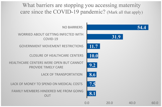 As evident in Figure 2, although the majority of postpartum women (54.4%) reported having no barriers to accessing maternity care during the COVID-19 pandemic, some barriers were reported, such as being worried about becoming infected with COVID-19 (31.9%), government movement restrictions (11.7%), closure of healthcare centers (10%), healthcare centers that—although open—could not provide timely care (9.2%), lack of transportation (8.6%), lack of money to spend on medical costs (7.5%), and “family members hindered me from going out” (8.1%) during the pandemic.